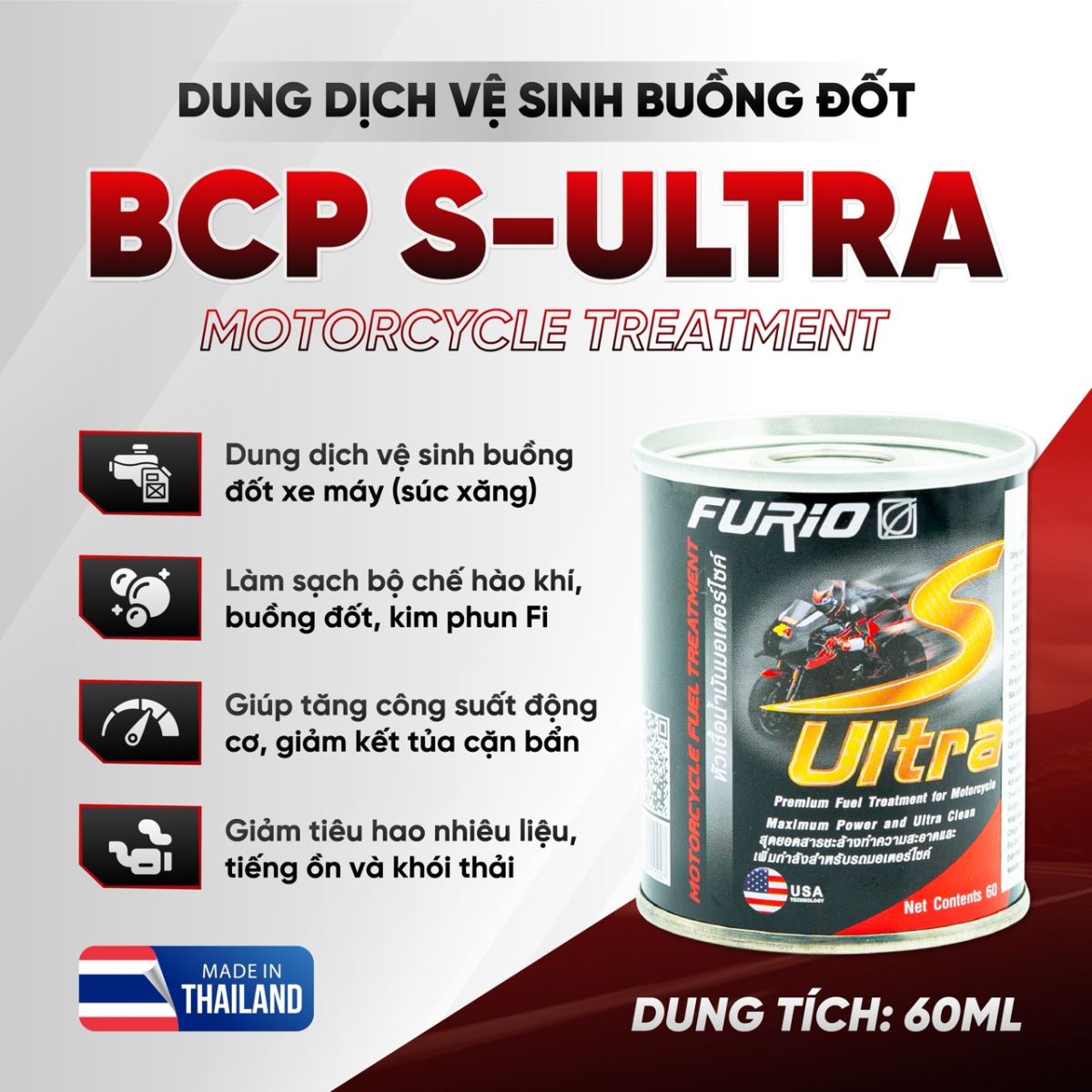 S-ULTRA thuộc dòng sản phẩm phụ gia chăm sóc và bảo dưỡng xe chất lượng cao của thương hiệu Dầu nhớt BCP Thái Lan. Dung dịch vệ sinh buồng đốt, kim phun, bình xăng BCP S-UTLRA được sản xuất từ phụ gia tẩy rửa với tỷ lệ xử lý đặc biệt theo công nghệ Mỹ. Dung dịch làm sạch, loại bỏ cặn bẩn, vết bám trong buồng đốt xe máy mà vô cùng an toàn cho hệ thống dẫn nhiên liệu của xe.